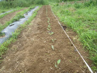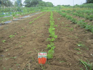 | ゴボウ、草取りし鶏糞をかけ軽めの土寄せ。2023.606.11 8:13 | ニンジン、数本立ちに間引きして、土寄せ。2023.06.11 8:43 |