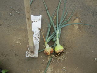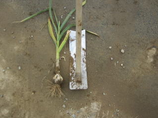 | 天気予報では午前11時頃から雨とのことなので、ネギ、キャベツ、ゴボウ、ニンジンの追肥土寄せをした。ニンジンは間引き作業を兼ねている。 ニンニクのお試し収穫、まだ早いのか水っぽかった。 |
