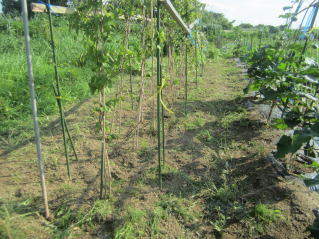 | 雨上がりに雑草取り。土が程よく柔らかいので窯の先がよく通る。がY国この機を逃すとジャングルと化す。風があったので比較的作業しやすかった。 夏野菜順調である。 |