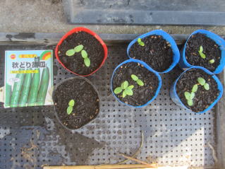 | 遅れていたジャガイモ収穫。雑草取り兼ねて、ジャガイモ収穫した。雑草たちに負けたと思っていたが、意に反して程よい大きさでの収穫。 キュウリ絶好調。秋キュウリ苗、発芽の確認をした。 |