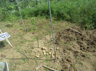 | 雑草だらけのジャガイモ箇所。厳しい。2023.07.23 13:05 | 雑草取り兼ねてのジャガイモ収穫。2023.07.23 14:22 |