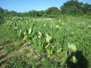 | 里芋のマルチ剥がし兼ねての雑草取り。猛暑下でのつらい作業だが、コオロギの鳴き声も聞こえてきた。秋は過ごすくそこまで来ている。 | |