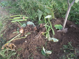 | 残った1畝のタマネギ定植。晴天化の中、タマネギ苗全部定植完了した。 里芋お試し収穫。どなたも不作と嘆いていたが、おらホの家庭菜園も同じ。猛暑が原因?芋煮にしていいただいたが、ホクホクいて美味であった。食感良し。 遅れていた青菜の間引き。漬物にしよう。 |