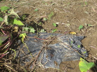 | 黒マルチ下にサツマイモ?2023.10.22 13:56 | 収穫したサツマイモ。多少、ネズミの被害あり。2023.10.22 14:01 |
