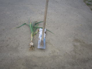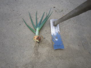| ニンニクお試し収穫。レンジで焼いて食したが、チョット早めでした。2024.05.25 10:06 | タマネギお試し収穫。チョット早め。水にさらして酢醤油にごま油、オカカをかけて頂きました。2024.05.25 12:06 |