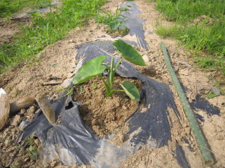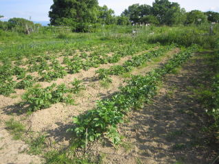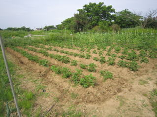 ジャガイモ、里芋土寄せ。ナス、キュウリ芽欠き。夏枝豆定植、秘伝まめ種まき。