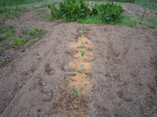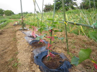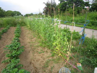 | サヤエンドウ種まきが遅かったのか、終盤を迎える? ここ数日の高温で、作物立が順調に大きくなってきた。管理も忙しくなる。 |