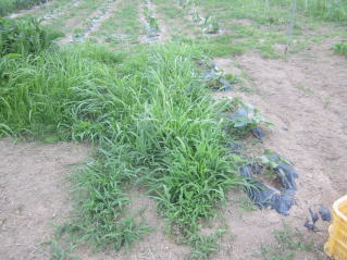 収穫前のタマネギ。雑草がひどい。2024.06.30 4:36  雑草取りしながらのタマネギ収穫。2024.06.30 5:31