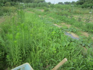 メロン、ニラ雑草取り前。2024.06.30 7:10 かなり手強い。2024.06.30 8:22