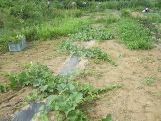 サツマイモ、メロン、ニラ、オクラ雑草取り。秘伝豆土寄せ。タマネギ全部収穫。メロン結実確認。ナス、シシトウ、キュウリ収穫。