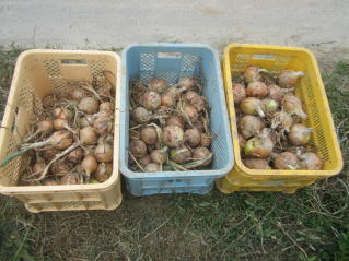 6月30日夕刻から降雨の天気予報。せかされる様にサツマイモ、メロン、ニラ雑草取り。タマネギ全部収穫をした。おかげで農作業がはかどった?