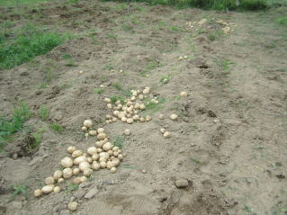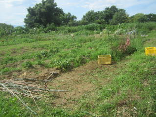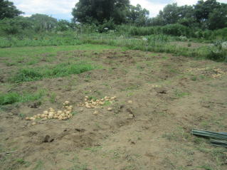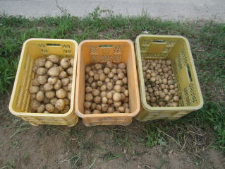 | 今日の夕刻から数日間、降雨の天気予報。ジャガイモの収穫を急いだ。 サヤエンドウの後片付けをした。この場所にコマツナを植え付けよう。 キュウリ、ナス、シシトウ、夏大根の収穫をした。 |