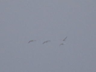 | おらホの家庭菜園、白い世界。午後から晴天の天気予報。2024.12.07 7:57 | 空を見上げると白鳥4羽。2024..12.07 7:57 |