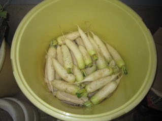 | とうとう白い世界となったおらホの家庭菜園。空を見れば白鳥が飛んでいる。来春まで農作業休止である。思えば今年も洪水被害。天候が熱帯化しているのが肌で感じる。 タクアン漬け込みを完了した。 |