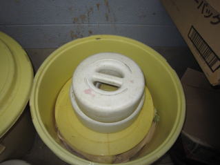 | 米糠に塩、タクアン付けの素を入れる。2024.12.08 10:34 | 干し大根を樽に置く。2024.12.08 10:40 |