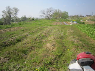 | ネギ、ナス、キュウリ等の植え付け場所。2025.04.27 8:34 | 雑草を取りながらの耕耘を完了。2025.04.27 10:49 |