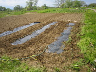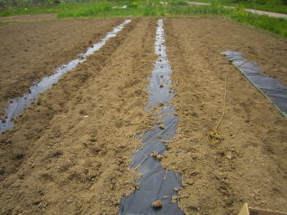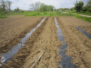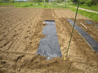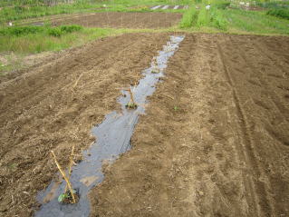 マルチ張りは開始。左はキュウリ用。2025.05.05 9:55 二畝作業完了。2025.05.05 10:44