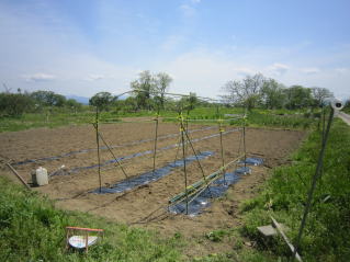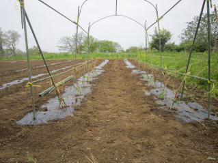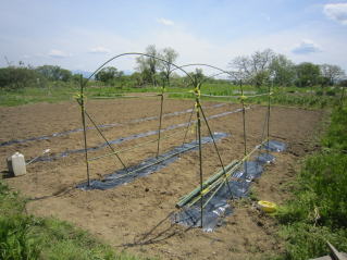 キュウリマルチ張り完了。2025.05.05 9:55 支柱建て開始。2025.05.05 13:15