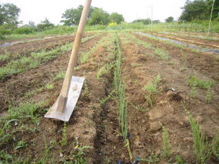 | 農作物が気がかり。早朝の下見をして週末の農作業段取りを考える。今のところ、これでも例年になく管理が良い? 里芋の芽が出てきた。 |