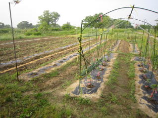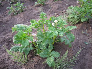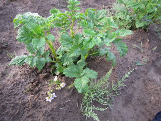 | 早朝の下見、ジャガイモの開花、ズッキーニの開花。里芋の芽。 | |