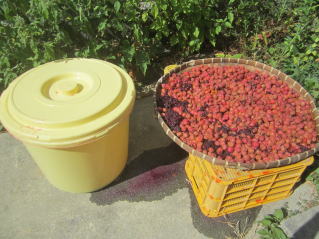 晴天を利用しての梅天日干し。樽内は梅汁。2025.08.03 8:38 回収した梅。2025.08.03 15:24