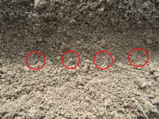 2種類の種を準備。2025.09.06 7:58 6センチほど間隔にして仮置き。1粒ずつ蒔くので時間がかかる。2025.09.06 8:00