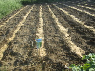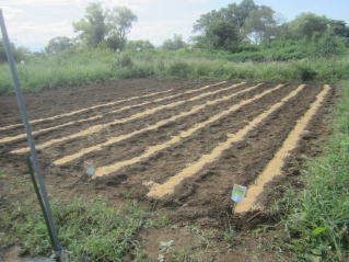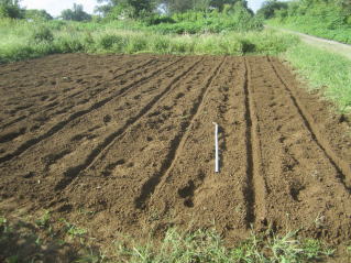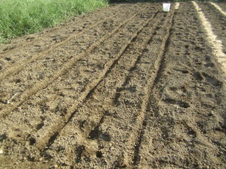 まずは耕うん。10日ほど前、1回目の幸運をし、苦り石灰を蒔いていた。2025.09.06 6:31 レーキングして三角鍬で溝を切る。2025.09.06 7:55