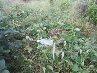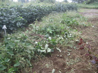 | サツマイモツル返し兼ての雑草取り。初秋、おらホの百姓家庭菜園。秘伝豆の実、確認。 |