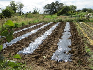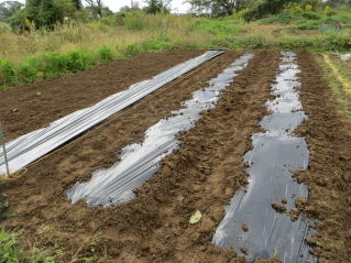 | 耕耘し、レーキング完了。降雨直後なので、力が必要だった。2025.10.13 10:29 | マルチ張り作業。2025.10.13 11:20 |