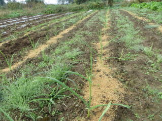 種まき完了。2025.10.18 10:28 ニンニク芽出し揃ってきた。雑草が目立ってきた。2025.10.18 7:53