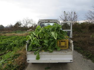 | 青菜、お裾分け用に収穫。2025.11.24 8:27 | 軽トラに積んで搬送。2025.11.24 8:53 |