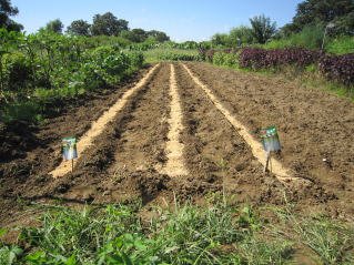 @良く耕した地面に深さ3センチメートル程度に、深さ約3センチの溝をV字状に掘ります。