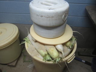 | タクアン付け。お試しに食したところ、ちょうどよい塩辛さであった。2022.12.10 17:00 |
