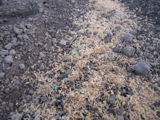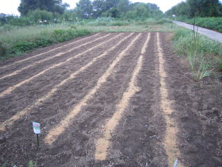@良く耕した地面に深さ3センチメートル程度に、深さ約3センチの溝をV字状に掘ります。