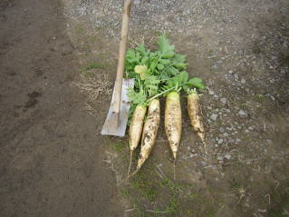 大根は秋11月に収穫します。このころになると太さ7〜8センチ、長さ50センチ程度に成長しています。