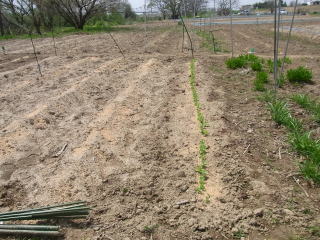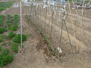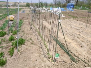 6センチ位になっら支柱を立てます。私は写真のような立て方をしています。材料は近くに自生している枯れたヨシと市販されているイボ竹を適宜利用しています。