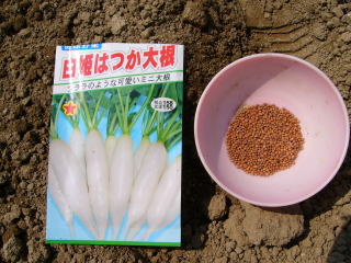 種袋の後ろを見ると蒔き時というのはないようだが、6月以降になると他の美味しい野菜が取れ始めるので「野菜に飢えている時期」に限定して栽培している。夏蒔きするとアッと言う間に「お化けミニ大根」になるので気を許せない。