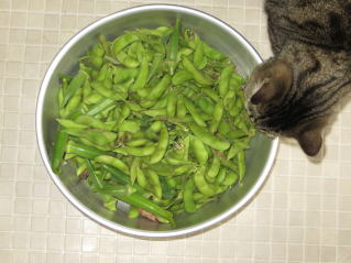 収穫した秘伝豆。2025.09.28 14:31 秘伝豆収穫。右上ニャンはモモちゃん。2025.10.04 14:20
