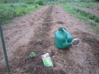 B2本ずつ植え付け、土を欠けます。溝も同時に埋めていきます。