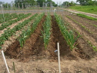 ニンニク、順調に生育しています。鍬と大きさを比較すると20