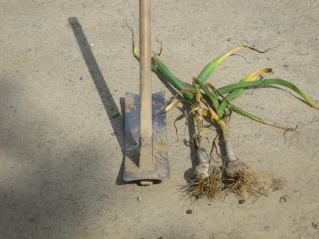 軸棒を切り落としての回収。今年のニンニク、大粒で出来が良かった。2025.06.28 17:52 |