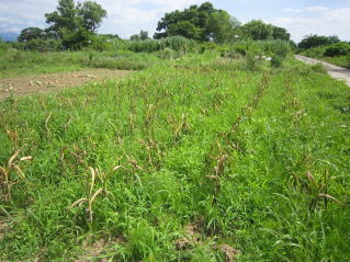 | 雑草に囲まれたニンニク。2025.06.28 14:49 |