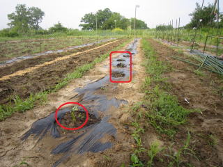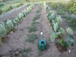 | 作業完了。黒マルチを剥がした。2025.07.05 11:59 | 連術水かけをしている里芋。元気が良い。2025.07.09 5:16 | ||||||||||||||||||||||||||