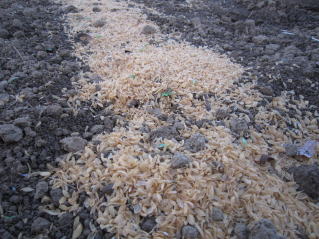 B軽く土をかけ、この上に籾殻を蒔きます。籾殻は土の固定と保水の効果が有るようです。