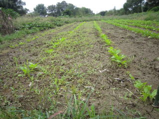 @良く耕した地面に1畝60センチくらいにし、ここに直径10センチほどの窪みを2 から3個ずつ30センチ間隔につくり 手の甲で平らにします。