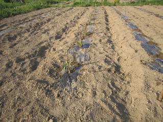 | 定植後、水をかけ、カヤ棒で風よけ支柱を立てる。2024.05.05 6:55 |