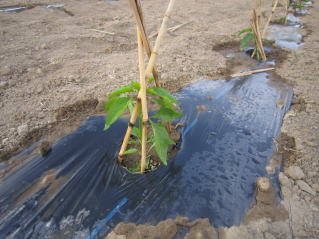 よく耕した地面に幅3〜4尺のマルチ(黒い農業用ビニール)を敷き、固定します。マルチの敷き方にはコツがありますが、おらホでは風のない早朝にしています。