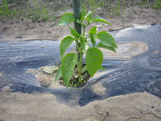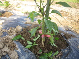 5月下旬頃、苗、葉っぱが濃い緑になって成長してきたら太めの市販イボ竹を支柱として立てます。