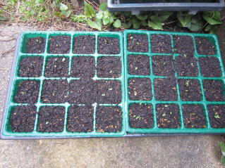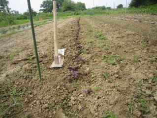 今回は種の蒔き方をスジ蒔きし、これを手のひらで軽く叩き種を固定してみた。 |