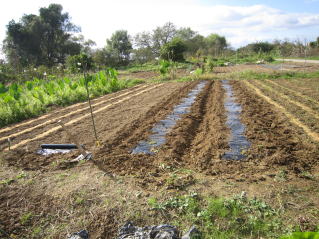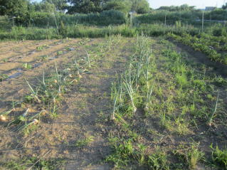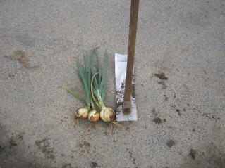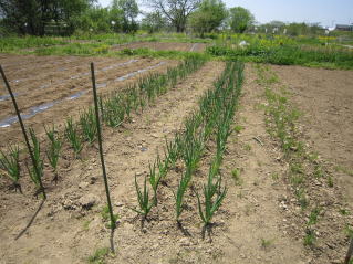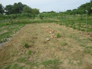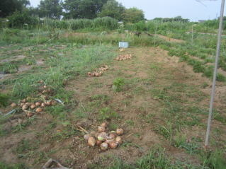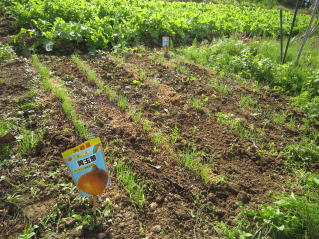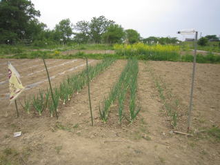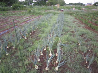 | タマネギはホームセンターで苗として売っているようですがコスト高。おらホでは秋に種を蒔いて苗を作り、定植します。収穫は翌年6月頃です。 種まき 蒔き時 例年9月1日前後にしている。人によってはポットに種を蒔き適当な大きさ(つまようじくらいの太さ、大きさ)になってから移植するが、おらホでは家庭菜園内で苗を作ってきた。 割り箸くらいの太さになってから定植している。 蒔き方 @良く耕した地面に高さ15センチ、幅45センチほどの床を作ります。 Aこの床に深さ3センチほどの溝を3本切ります。 Bここに1粒づつ種を筋蒔き風に置いていきます。この時まだ土を上掛けしません。 C買い求めた種の残り具合を確かめ、残っていたら適当に蒔き、足りないようだっらB種を拾い集め適宜蒔いていきます。 D土をかけてからその上に籾殻を籾殻を蒔きます。 ポイント 出来るだけ均等に薄く蒔き、間引きしないように心がけています。 手入れ 肥料 芽が出たら顆粒状肥料、尿素を蒔いています。ネギ類は肥料を与えた分だけ大きくなるようです。 雑草取り 雑草取りはマメにしなければなりません。 定植 準備作業 @良く耕した地面に尿素、油かすなど均等に降り、更に良く耕し数日間放置しておきます。 Aマルチ(黒いビニール)を敷き、固定します。これをまた、数日間程度放置しておきます。 定植 @穴開け器しい1畝3列、15〜20センチ間隔となるようにとなるように穴を開けていきます。 A1本ずつ苗を植えていきます。 定植後の手入れ 肥料 ネギ類は肥料を好むとありましたので、顆粒状肥料、尿素を2回ほど投入しています。おらホでいうサクヅカゲです。 収穫 例年6月中下旬頃でしょうか。適当な大きさのものから適宜収穫していきます。 |